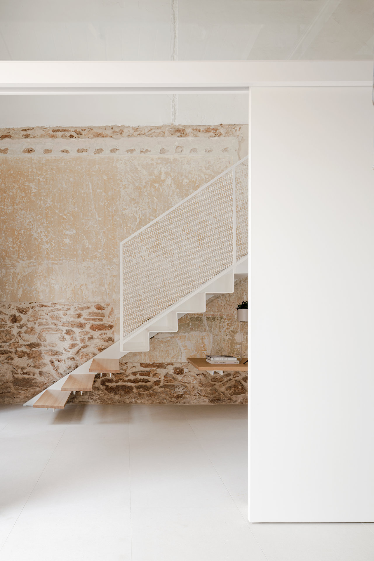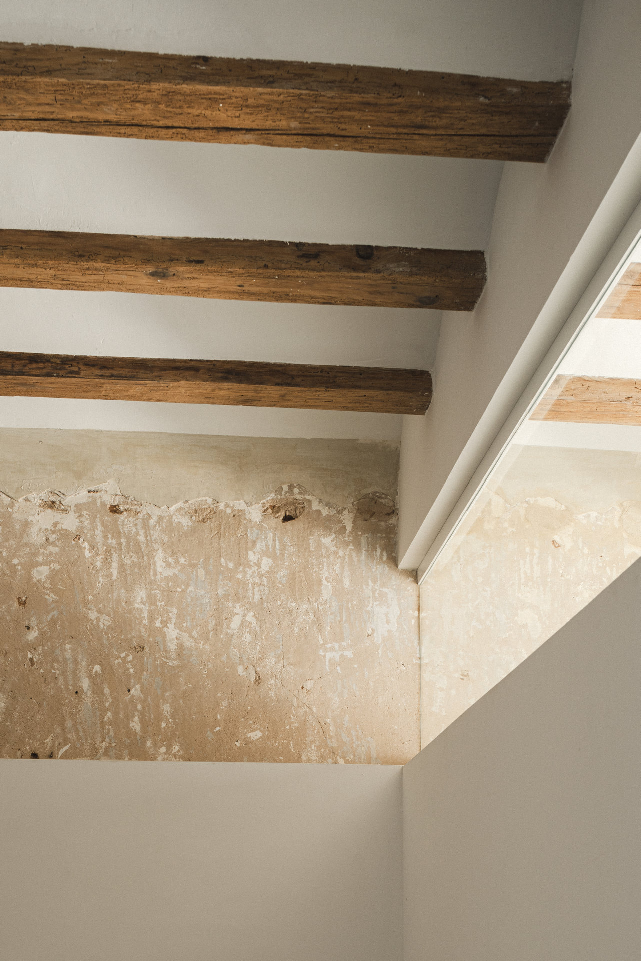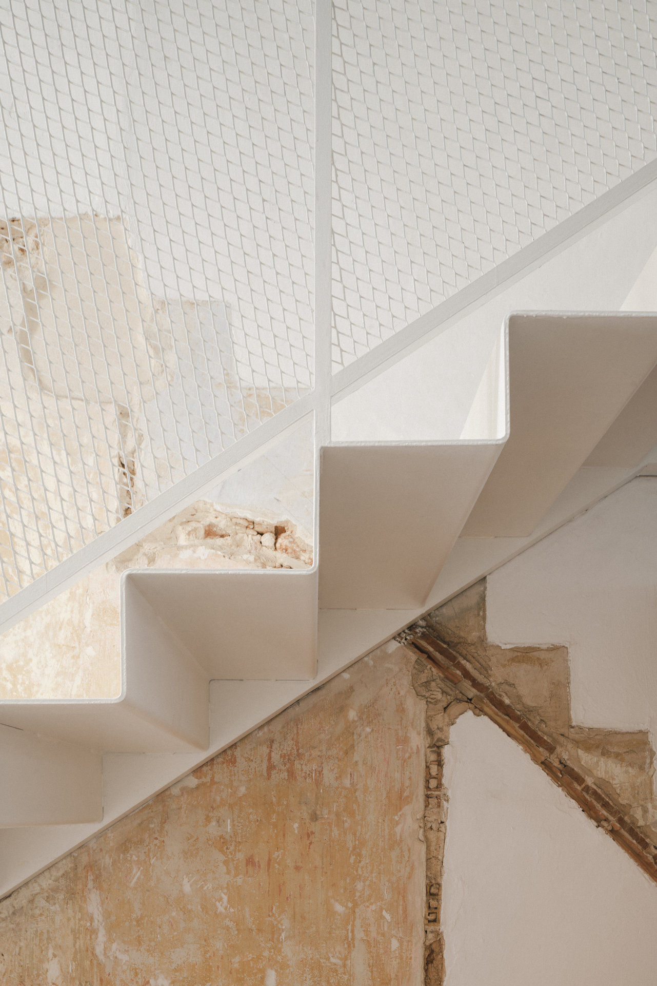Así, aparecen en las paredes las huellas del forjado o la bóveda de tabica de la antigua escalera, ahora sustituida por una escalera metálica de chapa plegada. Se utilizan, además, materiales contemporáneos fácilmente identificables que ofrezcan a la nueva construcción una imagen impoluta que contraste con la aspereza e imperfección de las capas más antiguas de la construcción primigenia.