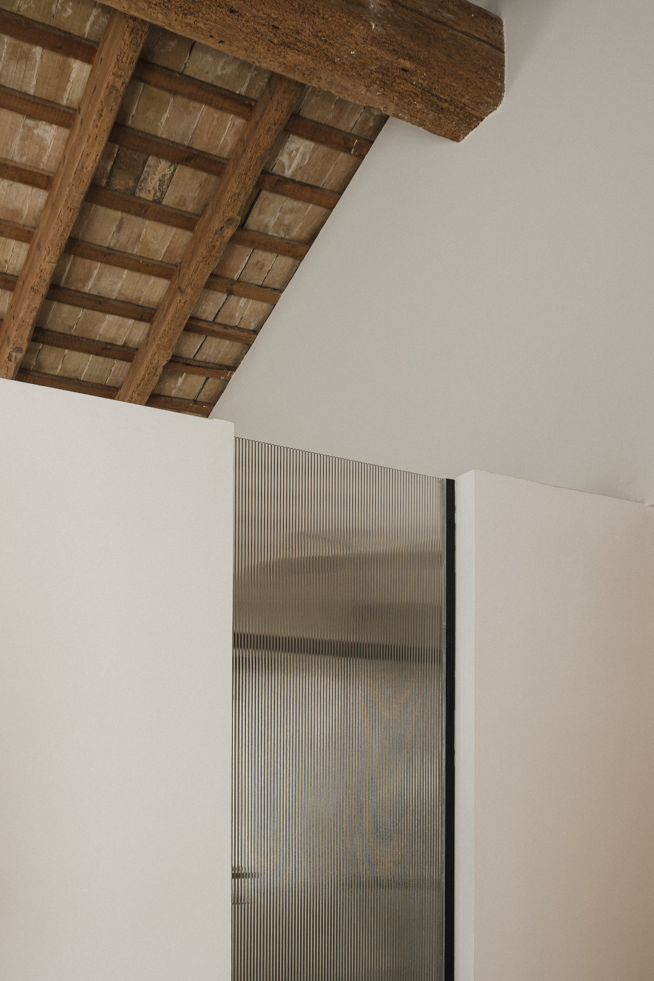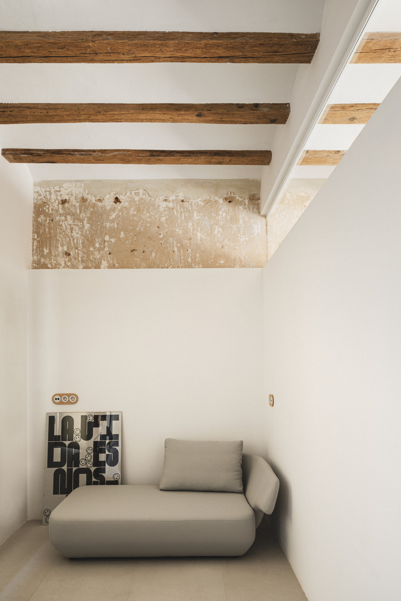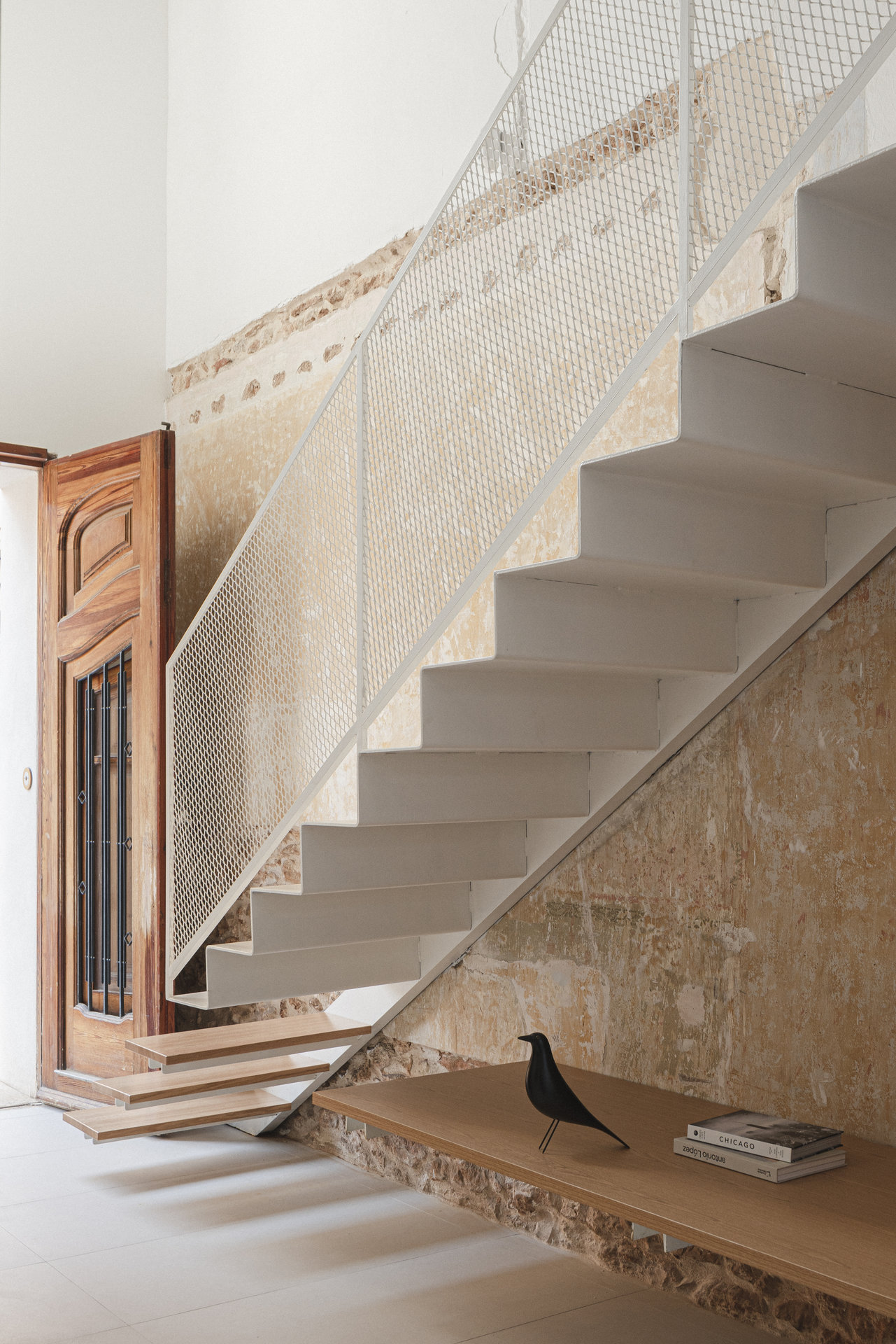 Así, aparecen en las paredes las huellas del forjado o la bóveda de tabica de la antigua escalera, ahora sustituida por una escalera metálica de chapa plegada. Se utilizan, además, materiales contemporáneos fácilmente identificables que ofrezcan a la nueva construcción una imagen impoluta que contraste con la aspereza e imperfección de las capas más antiguas de la construcción primigenia.
