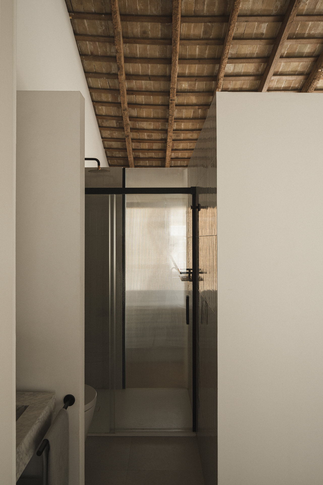 El espacio fluye de forma continua, interrumpido solo por el recuerdo de una puerta rescatada de la vivienda que filtra y protege el verdadero corazón de la vivienda; un corral que quiere ser parte del estar y un estar que quiere también ser corral. Y más allá, en lo más profundo de la vivienda, un espacio reservado para los invitados más excepcionales, aquellos que merecen adentrarse hasta lo más profundo del alma del anfitrión.