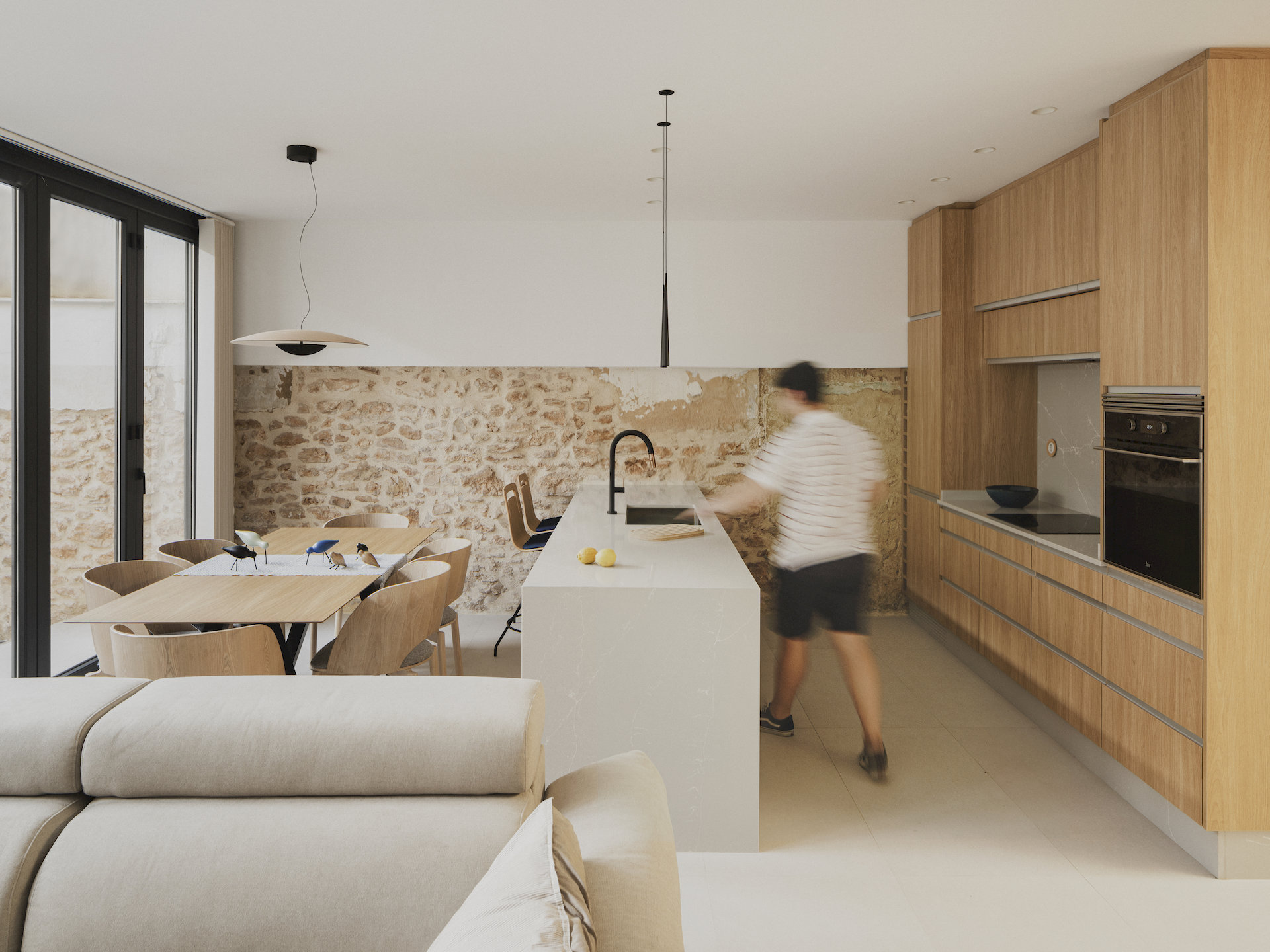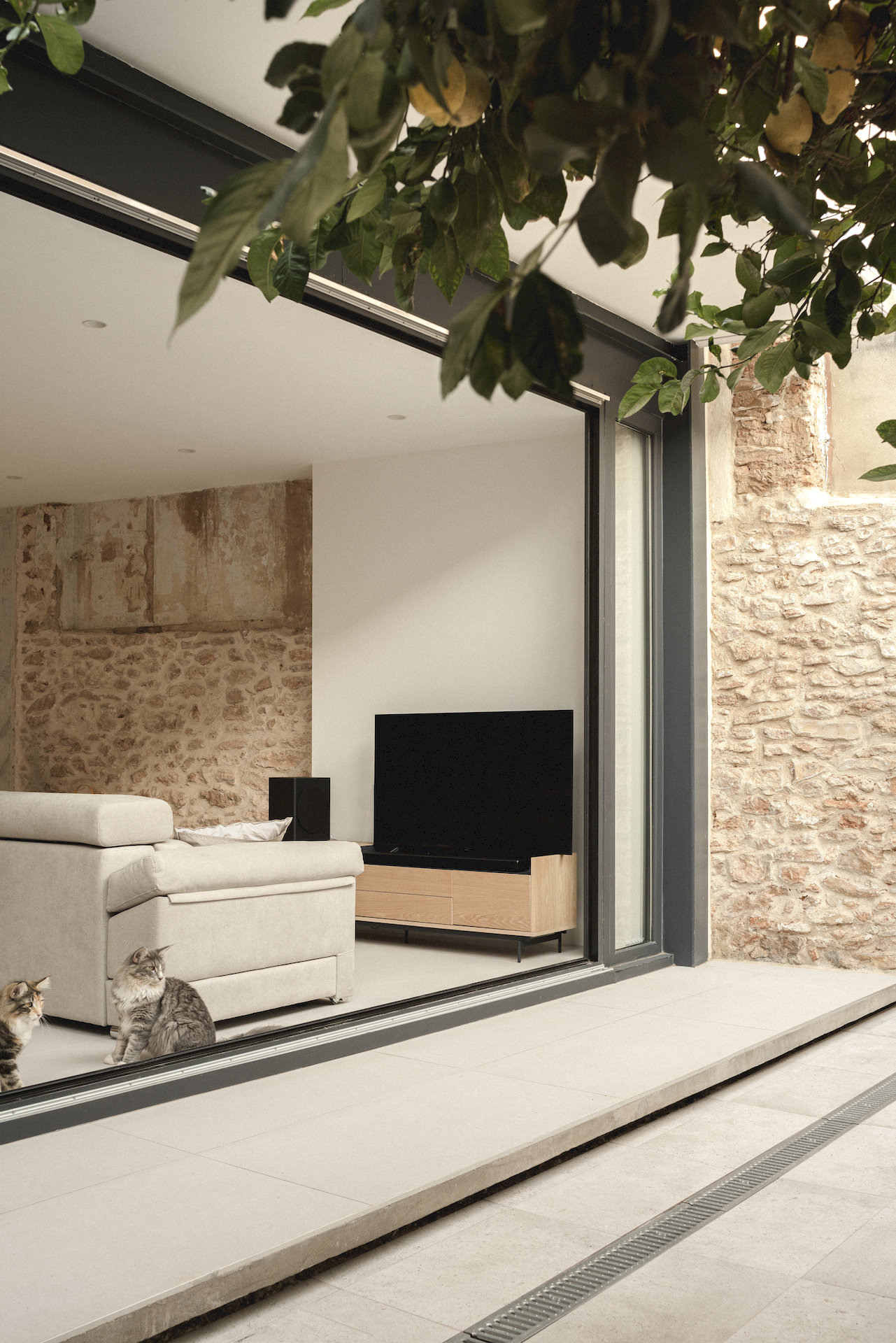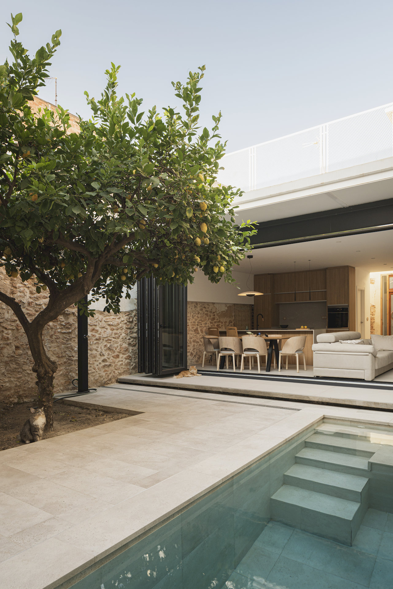 A medida que nos adentramos en la vivienda vamos ganando privacidad, hasta encontrarnos con el estar, que mediante un ventanal continuo, toma una inmensa bocanada de tranquilidad y frescura. En medio de este corral, y a modo de recordatorio de antiguas formas de vida, un viejo limonero rinde tributo a todos los que durante generaciones han habitado este edificio y se sirvieron de sus frutos.