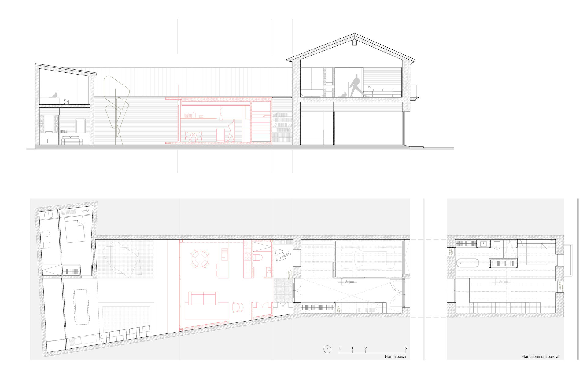 En la parte trasera, una vez superado el volumen original de la primera vivienda, se construye un pabellón de nueva planta como resultado de eliminar las ampliaciones del edificio original, de menor calidad constructiva, para así reinterpretarlas de nuevo.