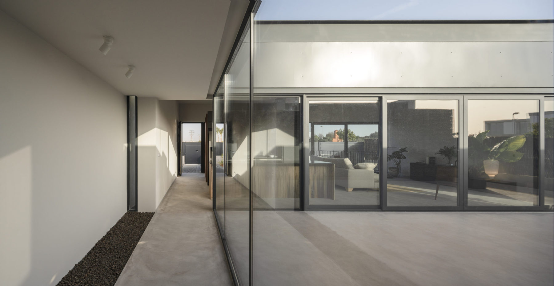 El segundo filtro lo encontramos en el patio central de la vivienda, que articula la zona de día y la zona de noche. Se trata de un filtro totalmente opaco, mucho más másico, que protege la parte más íntima y permite el uso independiente de una zona y otra. Independencia que se ve reforzada también por la disposición de las circulaciones y el esquema general de la vivienda en forma de peine de forma que las dos alas quedan unidas sin interferir entre ellas.