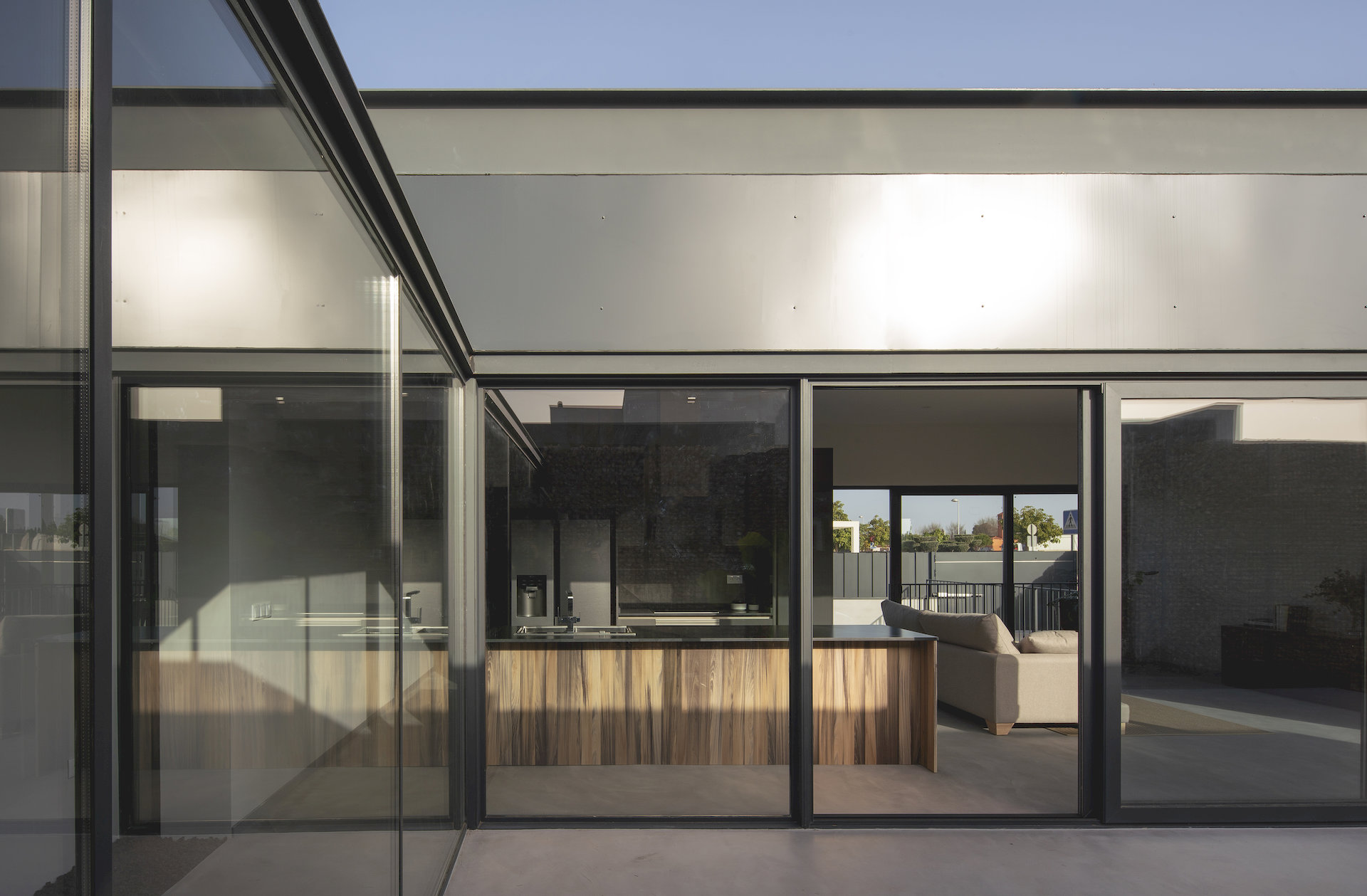 Otra de las premisas del proyecto fue crear diferentes filtros de privacidad en función del uso de la estancia que protegían. Por este motivo, el primer filtro de privacidad que encontramos al acceder a la vivienda es una piel metálica que, sin impedir el paso del aire o la luz, impide en buena medida las visuales hacia el interior desde el acceso de la misma.
